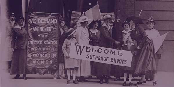 Suffrage envoys from San Francisco greeted in New Jersey on their way to Washington to present a petition to Congress containing more than 500,000 signatures. New Jersey United States, 1915. [Nov.-Dec] Photograph. https://www.loc.gov/item/mnwp000422/.